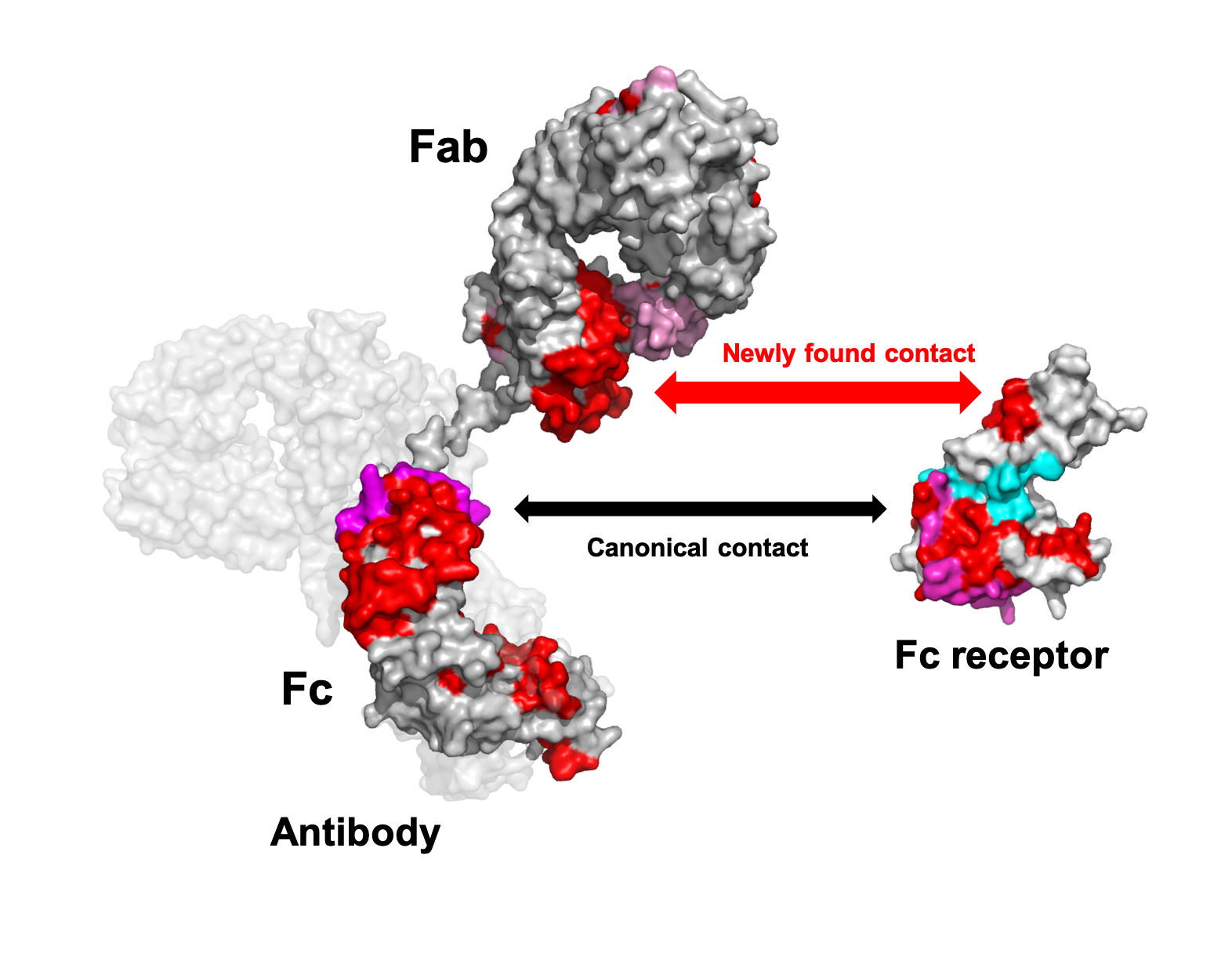 Mapping of the newly found contact sites between antibody and Fc receptor