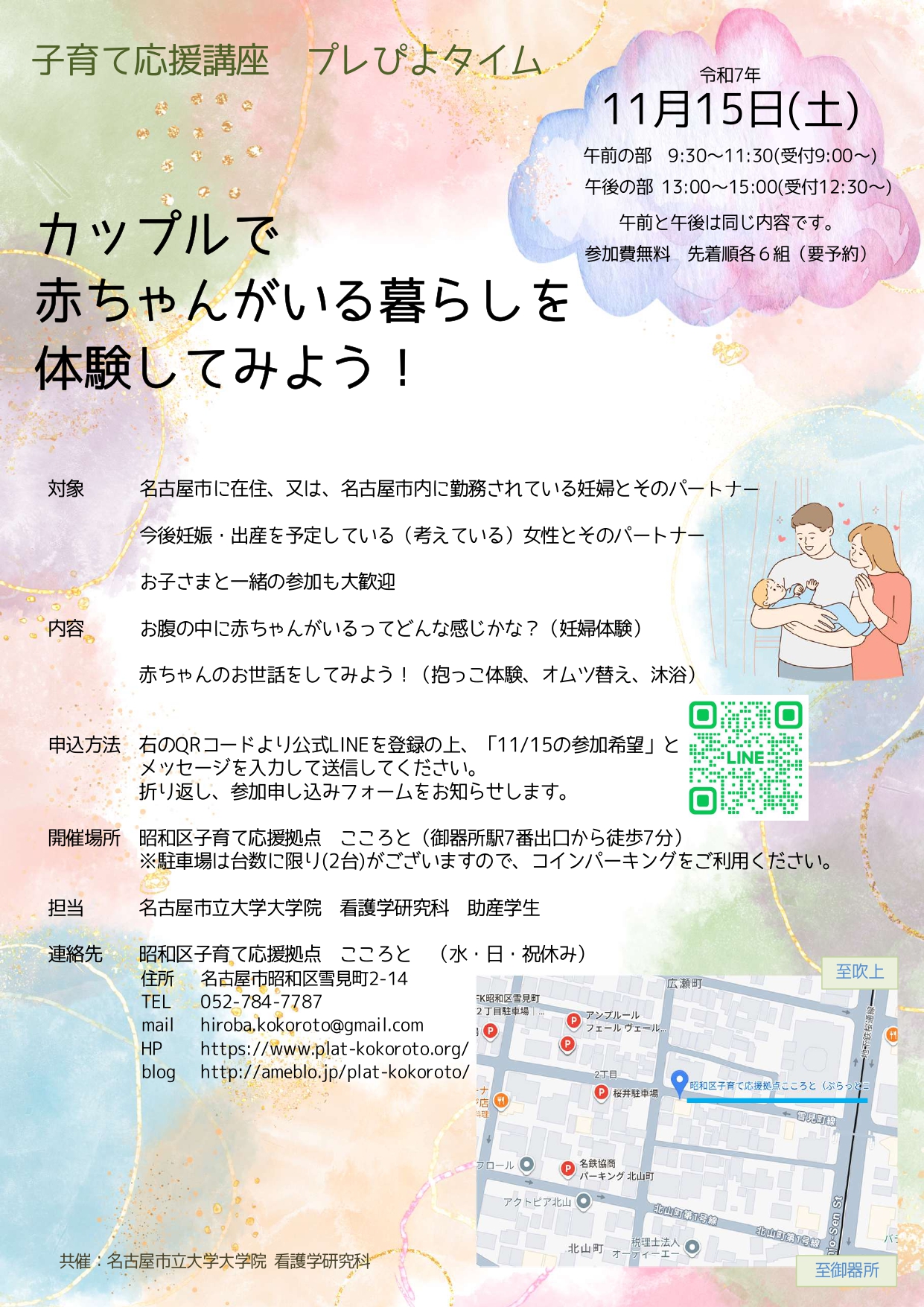 対象 | ◎名古屋市に在住、もしくは、名古屋市内に勤務されている妊婦とそのパートナー ◎今後妊娠・出産を予定している(考えている)女性とそのパートナー (お子さまと一緒の参加も大歓迎!) |