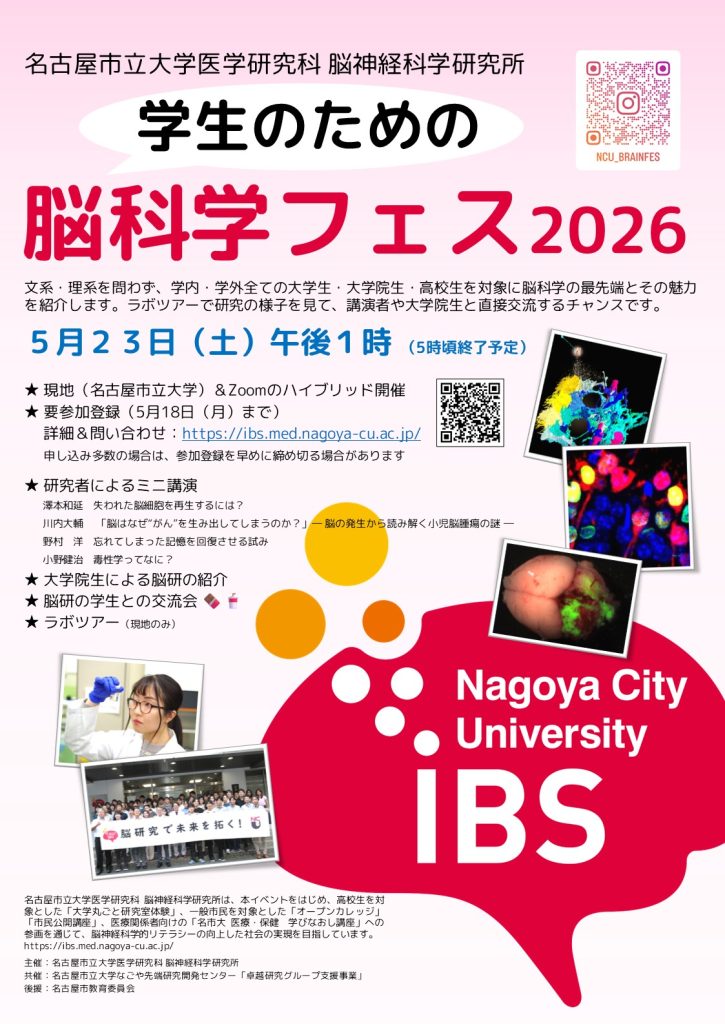 | 主催・共催・後援 | 主催:名古屋市立大学大学院医学研究科 脳神経科学研究所 共催:名古屋市立大学なごや先端研究開発センター「卓越研究グループ支援事業」 後援:名古屋市教育委員会 |