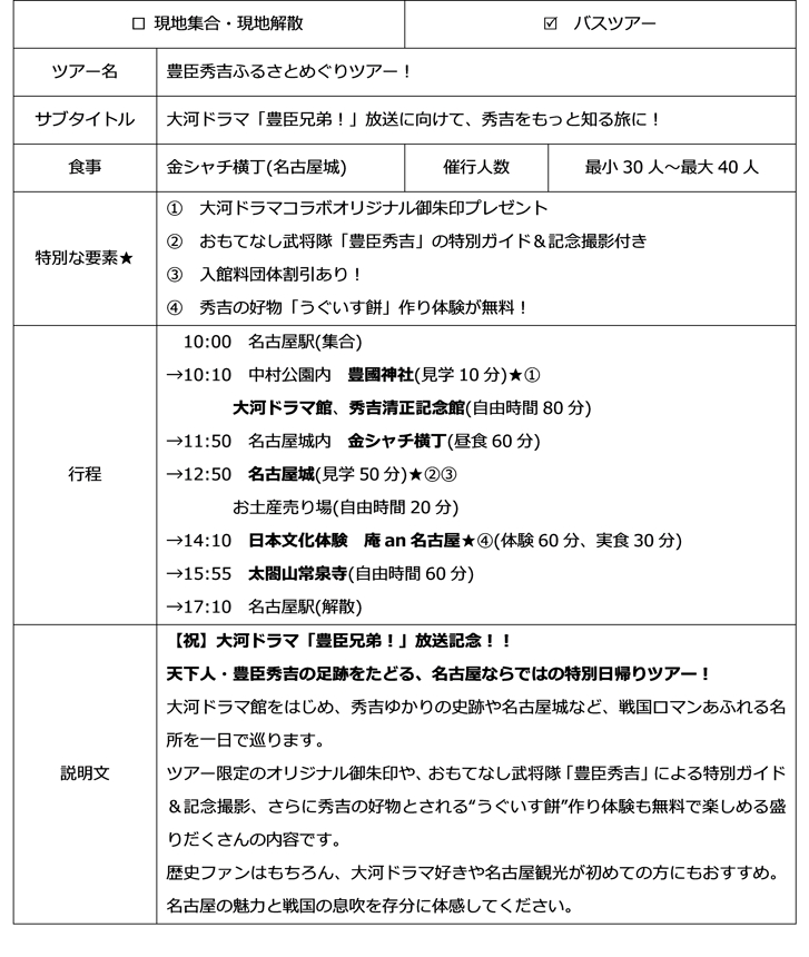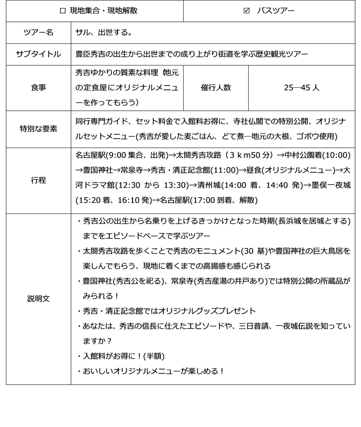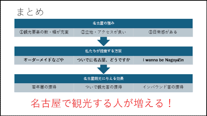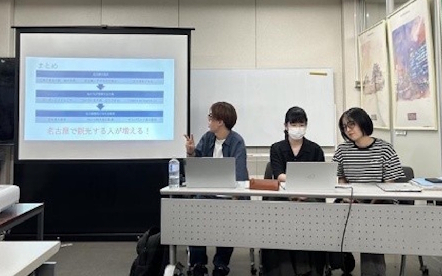名古屋の実情や名古屋にしかない強みや特徴を分析した上で、名古屋にあった売り出し方や魅せ方をしていくことが必要だと感じた。 【中村さん】 - 自分の地元をPRしたいのであれば自分の足で現地を訪れて楽しむことが大事だということを学んだ。ツアー案を作成するときに、実際に自ら足を運んで「面白い」「楽しい」と感じた観光地は紹介をしやすかったが、行ったことがない観光地については何を勧めればよいのかわからず、非常に紹介がしづらかった。