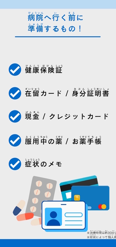 - 1ページ目【病院へ行く前に準備するもの】= 保険証や現金など受診前に準備するものを掲載