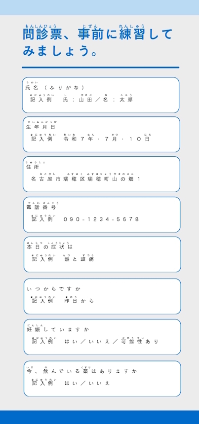 - 3ページ目【問診票、事前に練習してみましょう】= 問診票の書き方・記入例を紹介