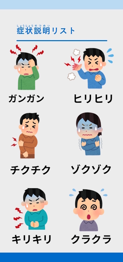 - 4ページ目【症状説明リスト】=「オノマトペ」とイラストを用い、指差し会話シート形式とすることで、痛みの種類や程度を医師に伝えやすくなるよう工夫