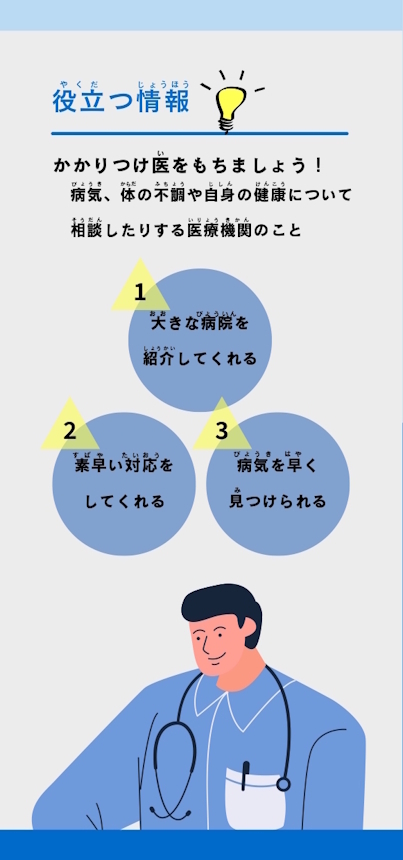 - 5ページ目【役立つ情報】=「かかりつけ医」の役割を説明し、日本で継続的に医療を受ける際のイメージづくりを手助け
