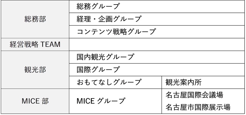 - 組織体制や部署ごとの業務内容など、名古屋観光コンベンションビューローの概要を理解