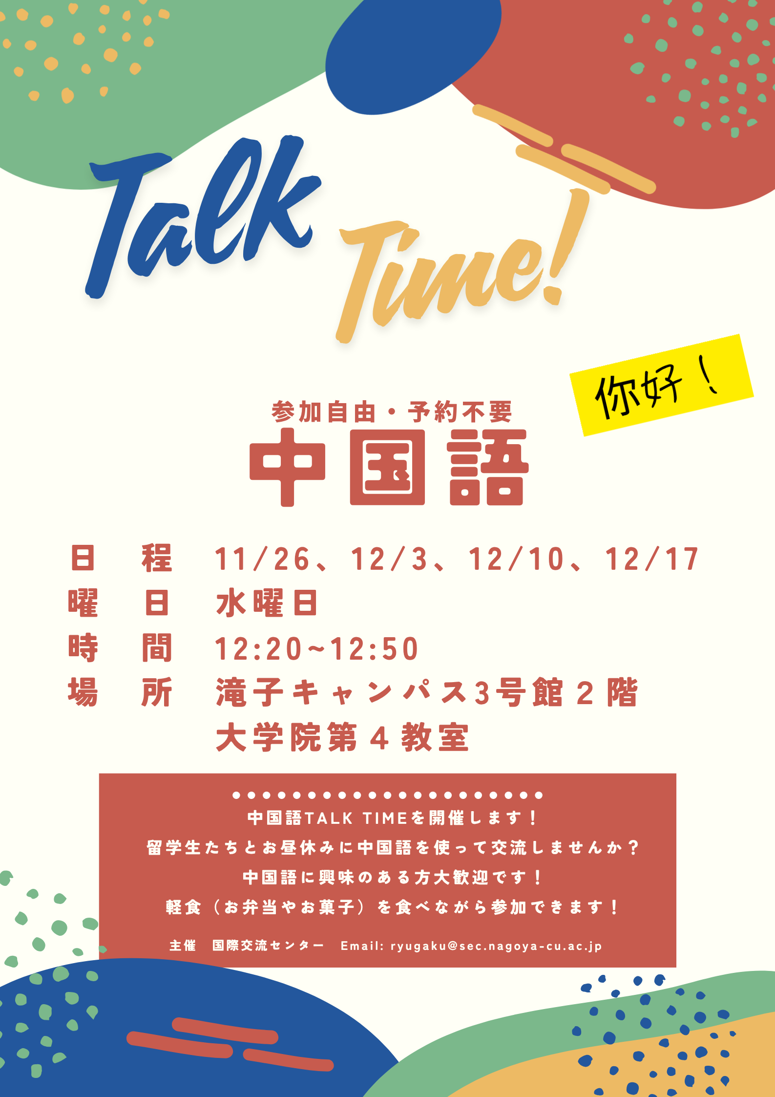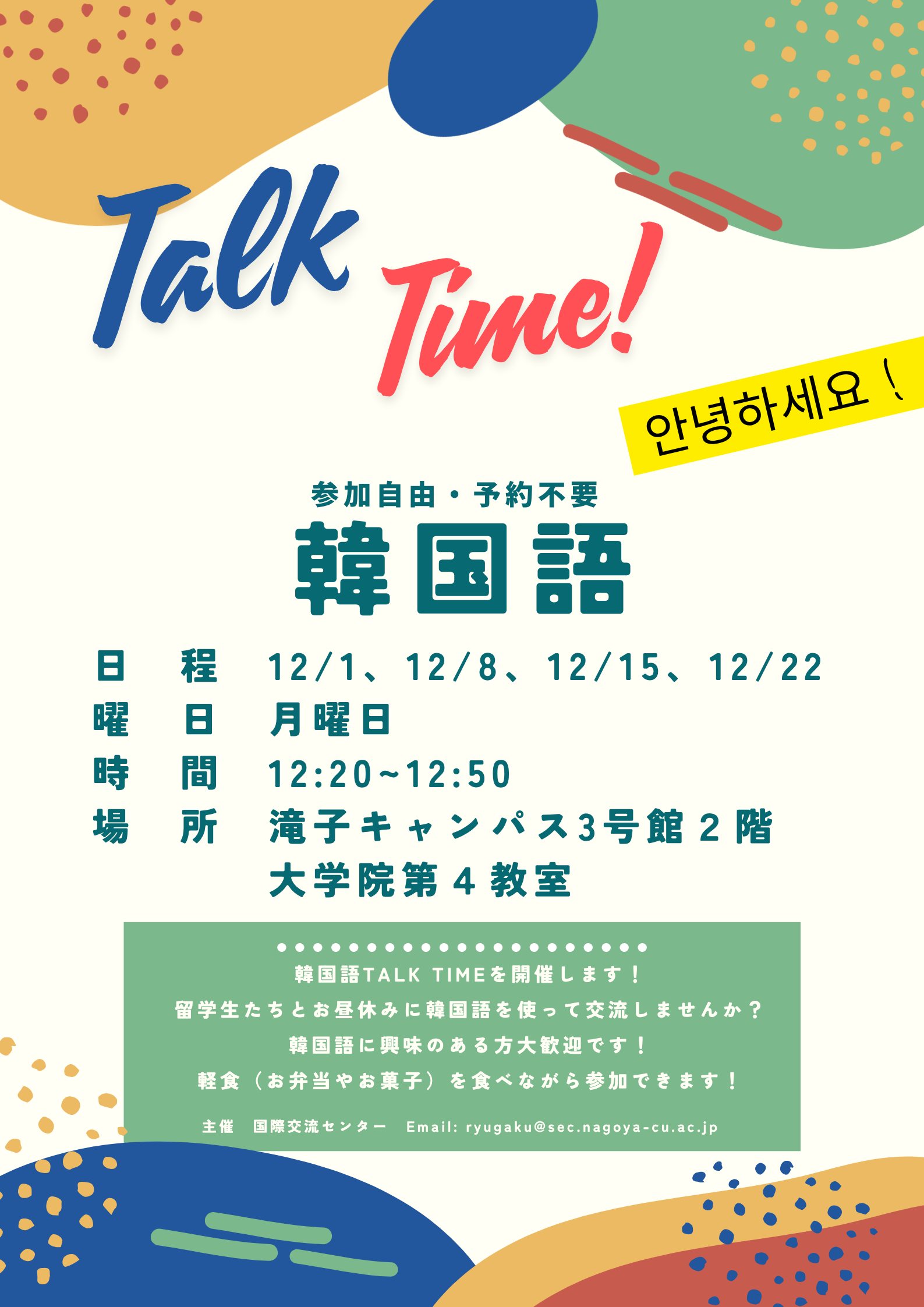 前回大人気だった中国語Talk Time、韓国語Talk Timeはまた後期にも開催します!