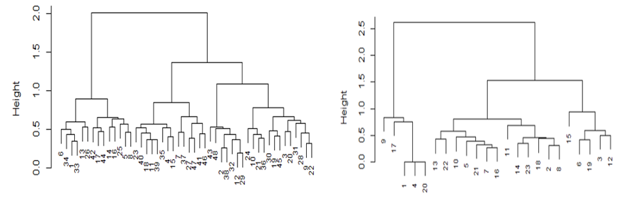 中学生(左図)と高校生(右図)の正誤傾向のデンドログラム