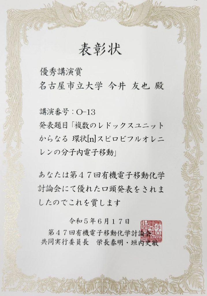 今井友也さんが「第47回有機電子移動化学討論会」において優秀講演賞を受賞