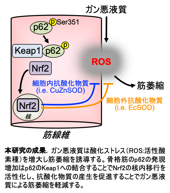 | 概要 | がん患者は、骨格筋の恒常性が破綻し筋量が減少(筋萎縮)します。がん患者における筋萎縮は、効果的な治療の妨げになることから、これを軽減することは重要な課題です。がんによる筋萎縮は、がん悪液質による酸化ストレスの増大が要因です。したがって、これを軽減することでがん悪疫質による筋萎縮の抑制が期待できます。そこで本研究では、オートファジー基質であるp62/SQSTM1に着目し、骨格筋の酸化ストレスを軽減する抗酸化物質の新たな産生機構の解明とがんによる筋萎縮抑制に対する役割を立証しました。本研究の成果は、がん悪液質による筋萎縮、さらには加齢やその他の慢性疾患による筋萎縮の予防や軽減に貢献が期待できます。 |