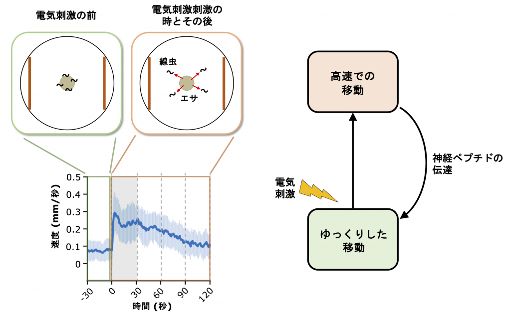 線虫に電気刺激を与えると、原始的な「恐怖」を感じて刺激が止んでも走り続ける。これには我々のホルモンに相当する神経ペプチドが関与することが明らかになった。