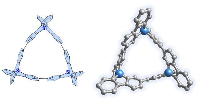 概要 共役π電子系化合物に基づくキラル光学材料は、次世代の3Dディスプレイやスピントロニクスデバイスなどへの応用が期待されるため、注目を集めている。我々はこれまで、ビフェニルユニットがスピロ炭素を介し直交して繋がったスピロビフルオレン誘導体をキラルビルディングブロックとして位置づけ、その連結により独自のキラル環状π電子系化合物の合成を報告してきた。今回、スピロ炭素を「ケイ素」に置換したキラル環状π電子系化合物を新たに設計した(図を参照)。有機ケイ素化合物は光学材料として有望であるだけでなく、スピロ元素を炭素からケイ素に替えることで、分子の形状を大きく変えることなく、HOMOやLUMOなどの軌道エネルギーを下げることが可能であるためである。本研究では、この分子の合成に成功するとともに、円偏光発光特性を含むこの化合物の特性を明らかにした。本研究で得られた知見は、新規なキラル光学材料の創出につながるだけなく、有機電子材料や多孔質材料の開発にもつながり得る。