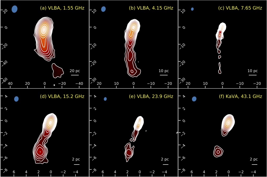 回の観測で撮影されたクエーサー1928+738から噴出するジェットの様子。6枚の画像はそれぞれ異なる電波の周波数帯で得られたものである。