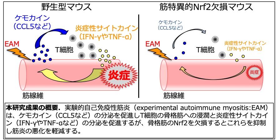 概要 特発性炎症性筋疾患である多発性筋炎は、自己免疫機序により筋組織が傷害され、筋量や筋力の著しい低下を引き起こします。多発性筋炎患者における骨格筋の機能と形態の悪化は,日常生活活動を制限し生活の質を著しく低下します。そのため、筋炎の有効な治療方法を分子レベルから解明し確立することは重要な課題です。しかしながら、その分子機構は未だ十分には明らかにされていません。本研究では、骨格筋のNrf2を消失すると、筋炎により増加する骨格筋のIFN-γなどの炎症性サイトカインの発現が抑制し、炎症性サイトカインによるケモカインの増加が抑制することでT細胞の骨格筋への浸潤を低下し筋炎の悪化を軽減する可能性を解明しました。