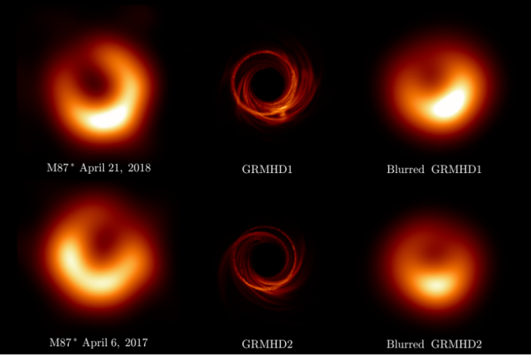キャプション:M87ブラックホールの観測画像(左)と理論画像(中央・右)。(左) 2018年(上)と2017年(下)に行われたEHTの観測で得られたM87ブラックホールの画像。(中央) 2つの異なる時間における一般相対論的磁気流体力学シミュレーションに基づく画像。(右) 中央の画像をEHTの解像度に合うようにぼかした画像。画像クレジット:EHT Collaboration