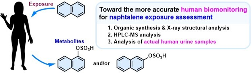 ナフタレン暴露評価のための精密なヒトバイオモニタリングを目指した研究。代謝物の構造式は、本研究で合成・分析したナフチル硫酸エステルの2つの異性体。
