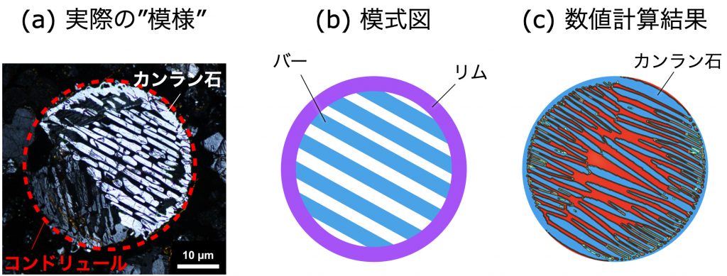 (a)コンドリュールに含まれる棒状カンラン石。白い部分がカンラン石の結晶である。(b)棒状カンラン石の模式図。コンドリュール周囲を取り巻くリムと、その内部にほぼ平行に並ぶ多数のバーで特徴付けられる。リムとバーは別々の結晶ではなく、単一の結晶である。(c)数値シミュレーションによって再現された棒状カンラン石に類似した結晶成長パターン(模様)。