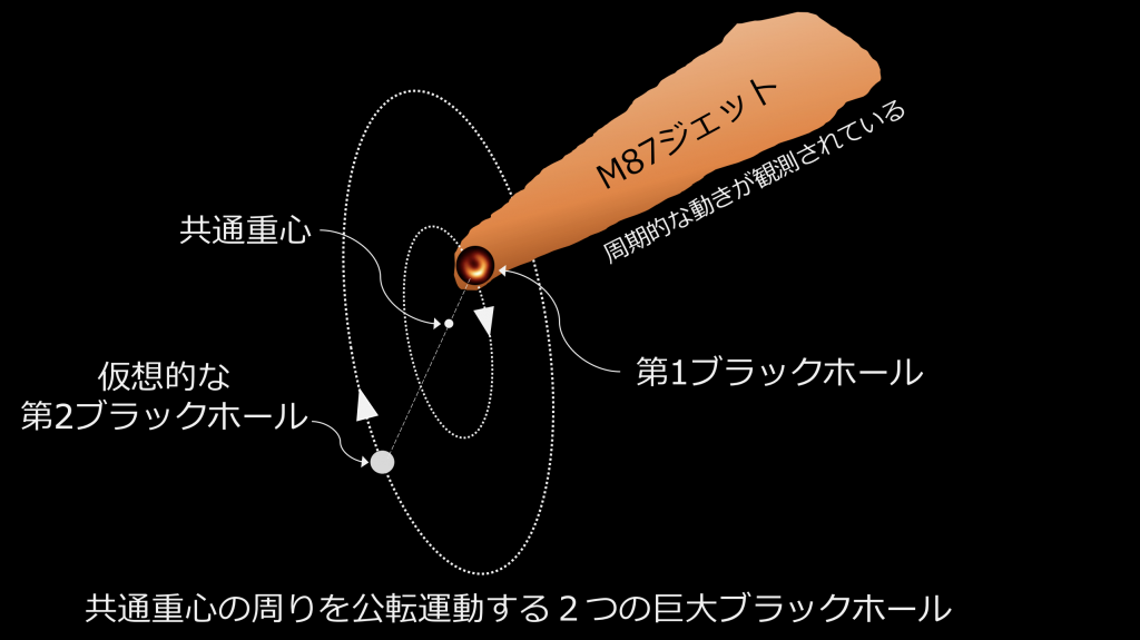 第2ブラックホールが存在すると仮定した場合の公転運動の概念図.VLBIで観測されているM87ジェットの根本にあるブラックホールが第1ブラックホールに対応します。第1ブラックホールが共通重心の周りを公転運動することによって、M87ジェットが周期的に揺れると仮説を立てました. クレジット:Kino et al. (2025), ApJ