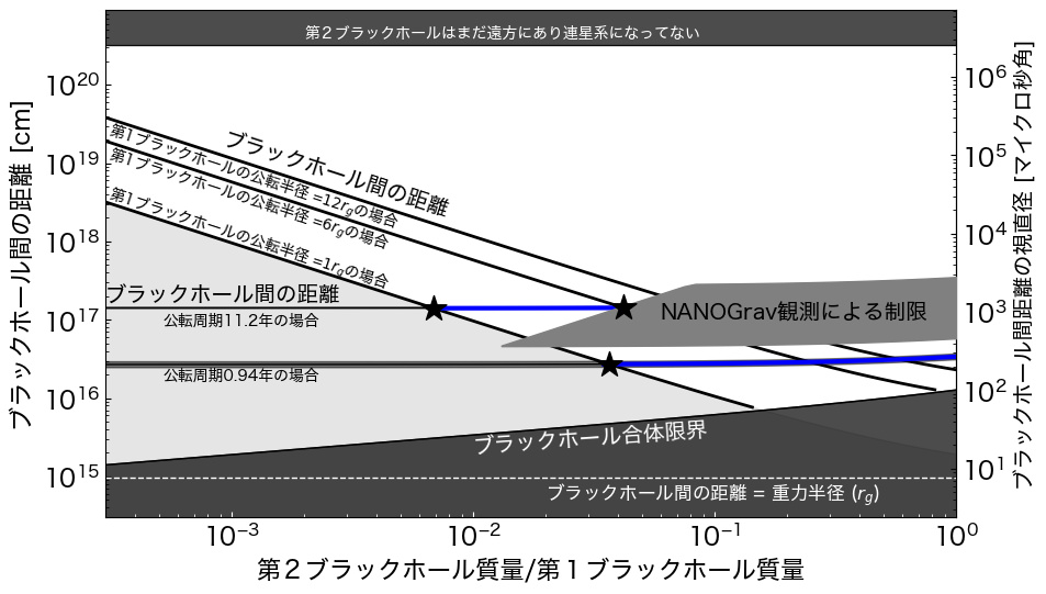 M87における仮想的第2ブラックホール質量の許容範囲.青色の線分が、許容される第2ブラックホールの質量と第1ブラックホールの質量比を表します.灰色で塗られた領域は、巨大ブラックホール連星としての条件を満たさず、除外された領域を示します. クレジット:Kino et al. (2025), ApJ