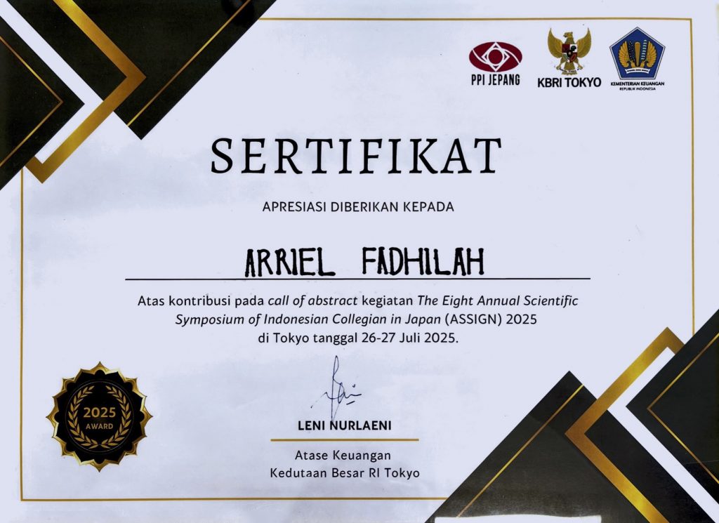 Arriel Fadhilah さん(木藤研・博士前期課程2年)が国際会議「Annual Scientific Symposium of Indonesian Collegian (ASSIGN) 2025 」において Best oral presentation 賞を受賞しました。