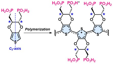| 概要 | 自己ドープ型導電性ポリマーは、ドーパント基が主鎖に共有結合していることからドープ状態の安定性に優れ、次世代の柔軟・軽量なエレクトロニクス材料として有望視されている。当研究室ではこれまで、従来用いられてきたスルホン酸基に比べて酸性が穏やかであり、かつ金属酸化物との高い親和性を有するという利点から、ホスホン酸基を導入した自己ドープ型ポリマーの合成に取り組んできた。本研究ではその発展として、ホスホン酸基を2つ有するC2対称なキラルEDOT(3,4-エチレンジオキシチオフェン)モノマーを設計・合成し、酸化重合によって立体規則性および位置規則性の制御されたPEDOT(ポリ(3,4-エチレンジオキシチオフェン))系自己ドープ型ホモポリマーを得た(図1)。得られたポリマーは、トリメチルアンモニウム塩の形で水に可溶であり、薄膜状態では0.11 S/cmの導電性を示した。また、本ポリマーは長鎖アルキルアンモニウム塩で処理することで有機溶媒に可溶化でき、その溶液中では、側鎖から主鎖へのキラリティ伝播に由来する円二色性(CD)応答が観測された。CD応答と導電性という光学・電子両面での特性を兼ね備えていることから、本ポリマーはキラルセンシングや円偏光応答デバイスなどへの応用が期待される。本成果は、立体・位置規則性を備えたキラル自己ドープ型ホモポリマーの合成に初めて成功した例であり、キラル導電性材料の構造設計および光電子機能の開拓に新たな指針を与えるものである。 |