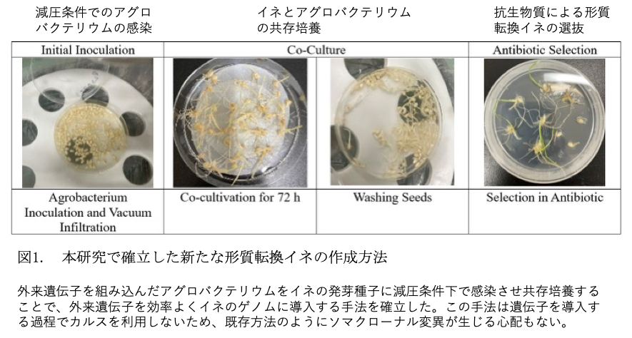 | 概要 | イネは、コムギやトウモロコシとともに世界の三大穀物の一つである。そして、それら人類にとって大切なイネ科植物の生理機能を分子レベルで解明するためのモデル植物にもなっている。よって、解読された全ゲノム配列が公開されており、世界中の研究室でイネの有用形質に関わる遺伝子の機能解析が進められている。ただし、イネ科植物の形質転換は容易でなく、遺伝子を改変させた形質転換イネを作成するには時間と手間を要する。また、形質転換に脱分化させた細胞(カルス)を利用するため、その増殖と再分化の過程でソマクローナル変異が生じる危険性が高いことも、問題となっている。 本研究では、それらの問題を解決するため、カルスではなく、発芽したイネの実生に減圧条件でアグロバクテリウムを感染させ、外来遺伝子をイネのゲノムに短時間且つ効率的に導入する手法の開発に挑んだ。そして、イネの形質転換効率を飛躍的に高めるとともに、ごく短期間で形質転換イネを作成する新たな手法(図1)を確立した。なお、この手法はカルスを使用しないため、ソマクローナル変異が生じる心配もない。今後は、形質転換イネを作成する手法の主流になると期待できる。 |