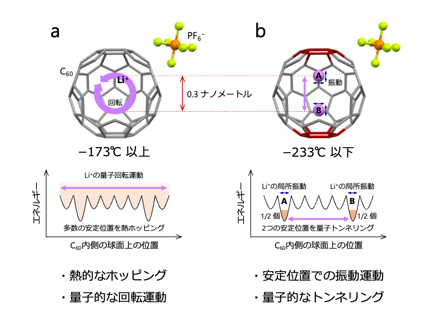 C60ケージに閉じ込めた1個のリチウムイオンの運動の温度変化。a: 100 K(−173℃)以上の高温、b: 40 K(−233℃)以下の低温