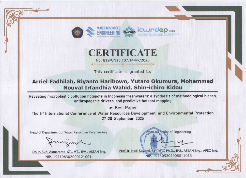 9月27日〜28日にインドネシアで開催された国際学会(The 6th International Conference of Water Resources Development and Environmental Protection)において、Arriel Fadhilah が研究成果(Revealing microplastic pollution hotspots in Indonesia freshwaters: a synthesis of methodological biases, anthropogenic drivers, and predictive hotspot mapping)を口頭発表し、Best Paper 賞を受賞しました。