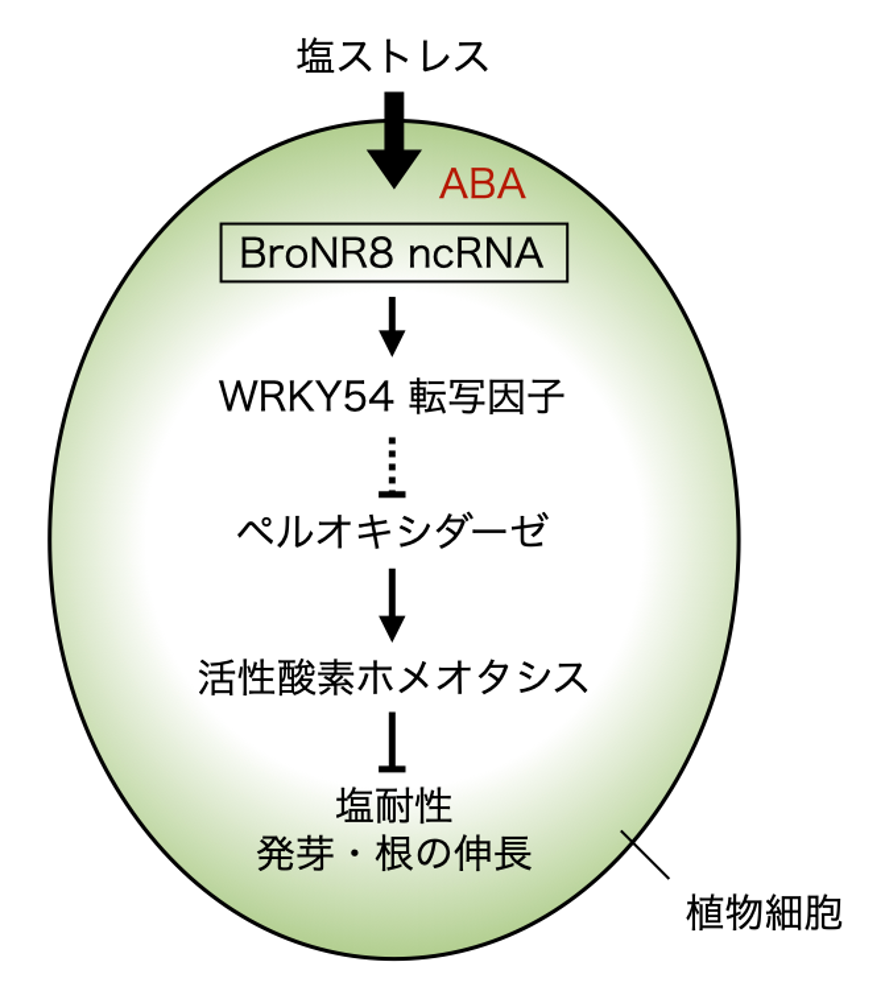 | 概要 | 塩分濃度の高い土壌は、作物生産量を大きく低下させる主要な要因です。高塩分が植物に悪影響を及ぼすメカニズムについては、まだ完全に解明されておらず、さらなる研究が求められています。この論文では、この塩ストレスに応答する非コードRNA(ncRNA)の機能について詳細に解析しました。具体的には、ブロッコリーの非コードRNA BroNR8が、植物ホルモンのアブシジン酸の影響を受けて、植物の塩耐性にはたらくことを初めて示しました。さらに、この作用は、塩ストレス応答において重要な役割を担うWRKY54 転写因子を介した活性酸素(ROS)の制御を通じたメカニズムであることを突き止めました。今回、ncRNA(非コードRNA)によって媒介される植物の塩分ストレス応答の新しい分子ネットワークを明らかにしたことにより、ストレス耐性品種開発への応用が期待できます。 |
