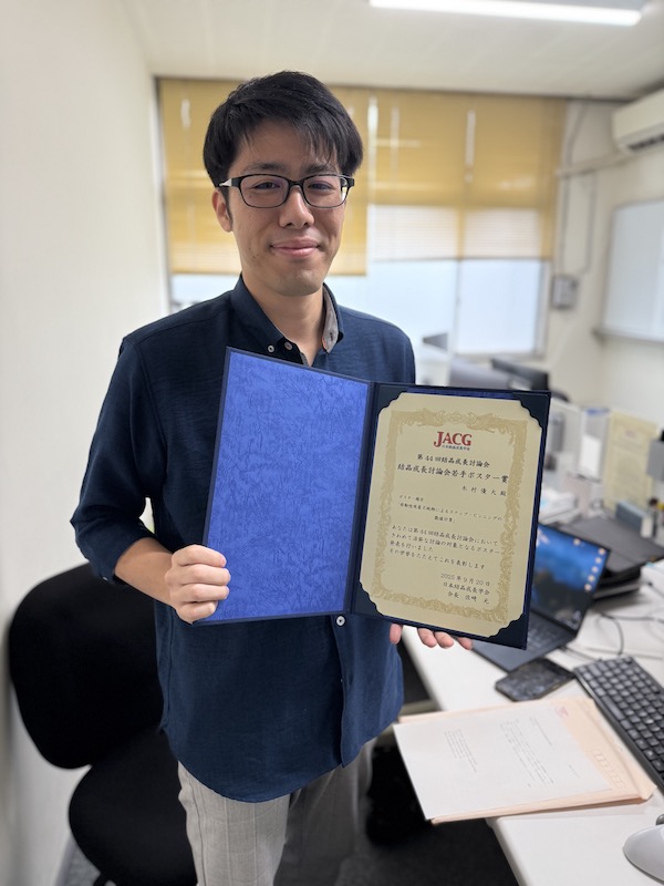 木村優大さん(三浦研・博士後期課程1年)が討論会において若手ポスター賞を受賞 9月18日〜20日に開催された結晶成長討論会(広島)において、木村優大君が研究成果「移動性吸着不純物によるステップ・ピンニングの数値計算」をポスター発表し、若手ポスター賞を受賞しました。