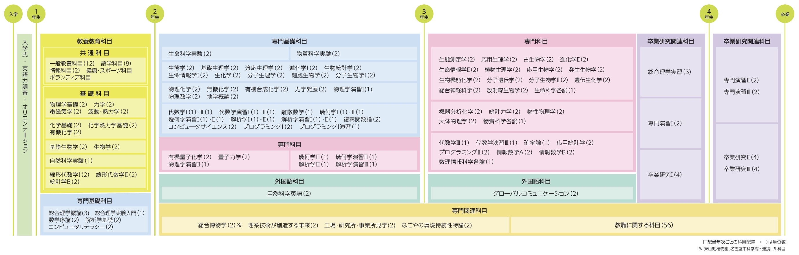 - 生命科学を中心に理学を総合的に理解するため、理学の基礎を学ぶ科目を配置する。