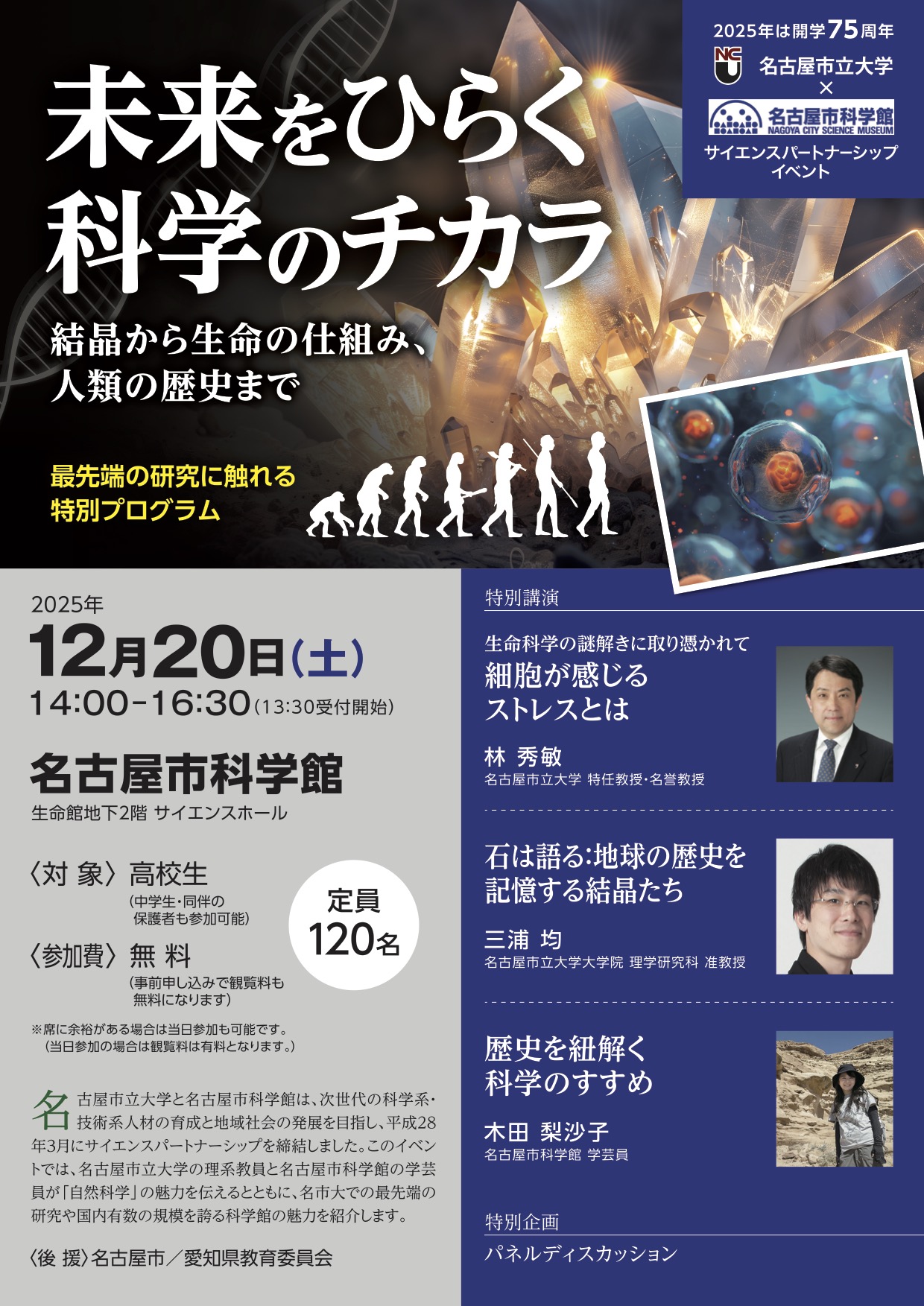 12月20日(土)に、中高生を対象とした名古屋市立大学と名古屋市科学館のサイエンスパートナーシップイベント(講演会)を開催します。