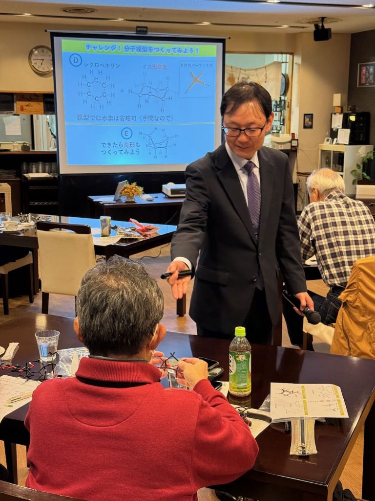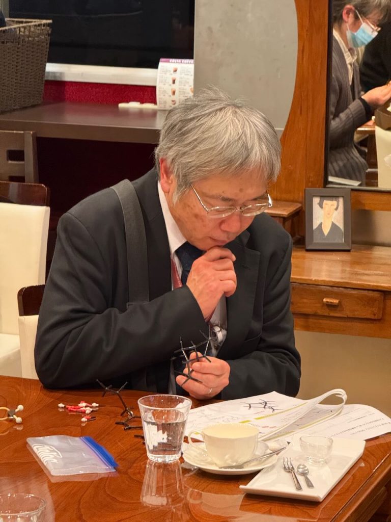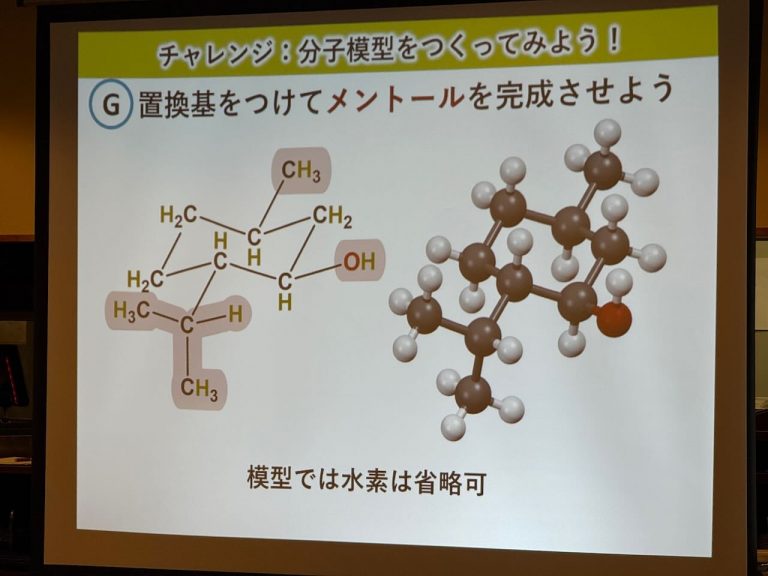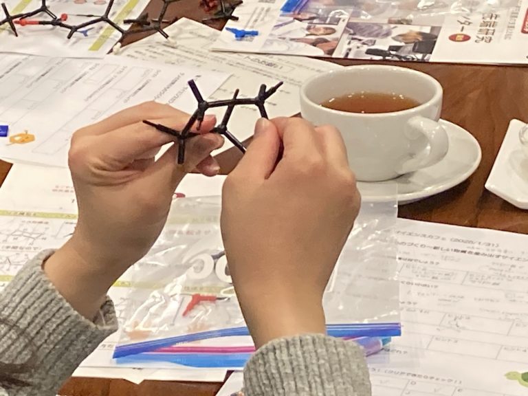 その後は、参加者ひとりひとりに分子模型のセットが渡され、いくつかの有機分子を組み立ててもらいました。組み立てた分子模型を元に、その立体構造や機能性が雨夜さんによって分かりやすく解説されていきます。参加者の皆さんも、手元の分子模型を手に持っていろんな角度から眺めてみたり、ぐにゃぐにゃと曲げて剛性を確認したりしながら、雨夜さんの話に聞き入っていました。