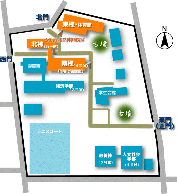 総合生命理学部・理学研究科の研究室は,1号館・4号館・5号館・東棟に分散しています。一部の研究室は田辺通キャンパスにあります。