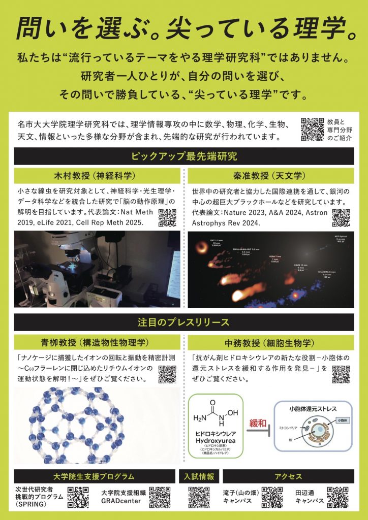 情報公開・刊行物 ページ内目次 総合生命理学部・大学院理学研究科 未来座標–名市大理学部ニュース 大学院パンフレット 全学 総合生命理学部・大学院理学研究科 総合生命理学部は,2018年4月に開設された理学系学部です。大学院システム自然科学研究科は,2020年4月に「大学院理学研究科」へ名称が変更されました。 総合生命理学部・大学院理学研究科パンフレット(2025年度版) (PDF ファイル 13.13MB) 総合生命理学部の紹介動画 (全学のサイト「ビデオライブラリー」にて,「学部紹介」をクリック) 未来座標–名市大理学部ニュース 創刊号(2025年7月) (PDF ファイル 7.56MB) 第2号(2026年2月) (PDF ファイル 3.94MB) 大学院パンフレット 2026年2月26日公開版 (PDF ファイル 9.09MB) 全学 【受験生向け】名古屋市立大学 大学案内