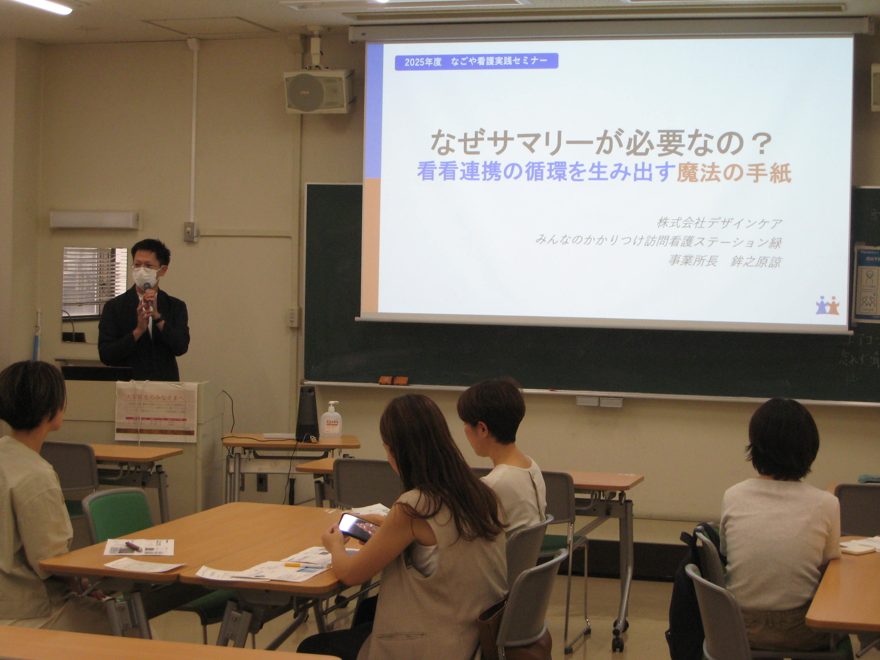なごや看護実践セミナー「スムーズな連携のための情報共有 看看連携推進!ナースの力で患者さんの希望を叶えよう!」は、みんなのかかりつけ訪問看護ステーションの鉾之原諒先生、名古屋市立大学病院皮膚・排泄ケア認定看護師の中尾敦子先生、名古屋市立大学病院がん看護専門看護師の鬼塚真実先生を講師として対面で開催いたしました。講義では「サマリーは患者さんの希望をかなえるための魔法の手紙である」との考え方が提示され、実際にサマリーを通じて情報共有がなされたことで、患者の希望に沿った援助が可能となった事例を交えて講義をしていただきました。また、訪問看護の現場で対応する機会が多いストーマケアや皮膚トラブルへの対処方法について、具体的な事例を示しながら解説をして頂きました。講義、事例検討、フリーディスカッションを通じて、病院と訪問看護の現場それぞれの状況を共有することができ、充実したセミナーとなりました。受講者の皆様には、本日の学びを是非、実践に活かして頂きたいと思います。