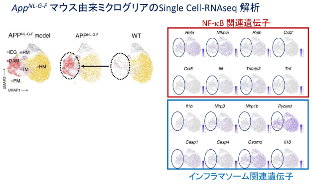 図5. UMAP上の黒丸で囲まれた部分が疾患関連ミクログリア(DAM)を示している。AppNL-G-Fマウスでは野生型マウスに比べてDAM集団の増加が認められた。この集団では、NF-κBおよびインフラマソーム関連遺伝子の発現は高まっていなかった。