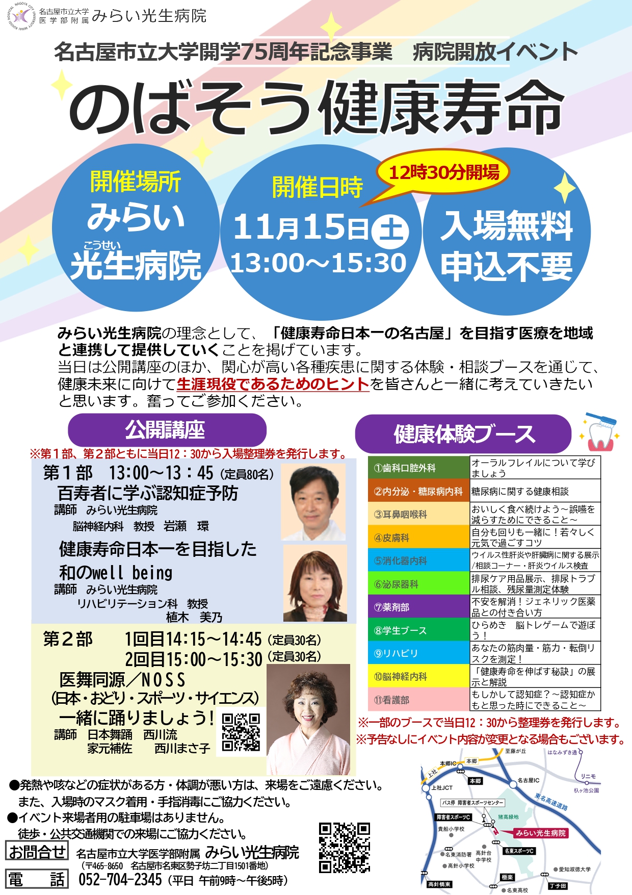 名古屋市立大学医学部附属みらい光生(こうせい)病院は、「健康寿命日本一の名古屋」を目指す医療を地域と連携して提供していくことを病院の理念として掲げており、今般、下記のとおり病院開放イベントを開催いたします。当日は公開講座のほか、関心が高い各種疾患に関する体験・相談ブースを通じて、健康未来に向けて生涯現役であるためのヒントを皆さんと一緒に考えていきたいと思います。