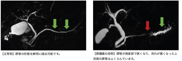 膵臓がんの早期発見には膵管の形態変化が有用と言われています。MRCPは、MRIを用いて「膵管」や「胆管」の形を詳しく調べる検査です。膵管のわずかな“狭さ”や“ふくらみ”を見つけることで、膵臓がんの早期の異常を見逃さずに発見できる可能性があります。