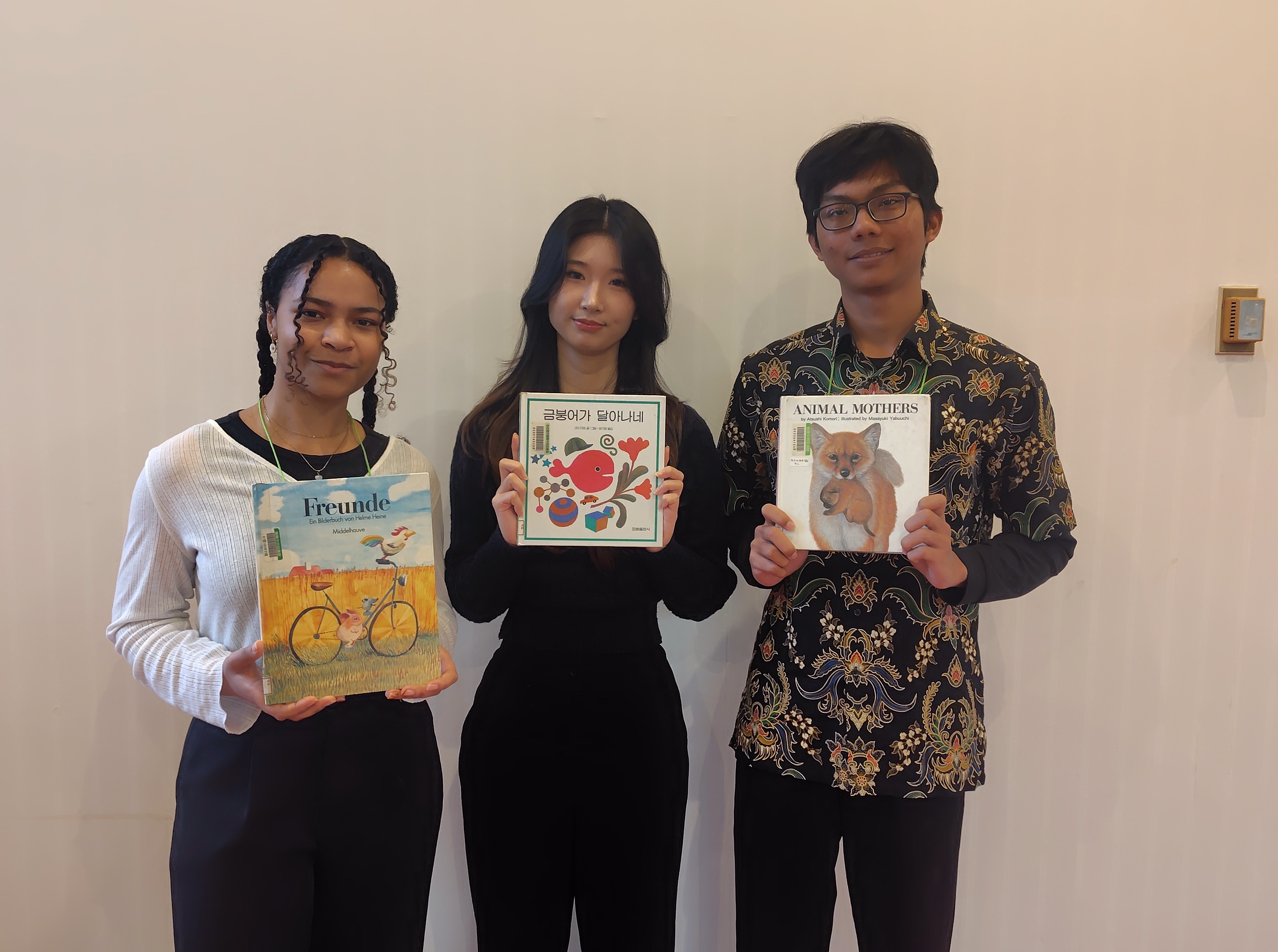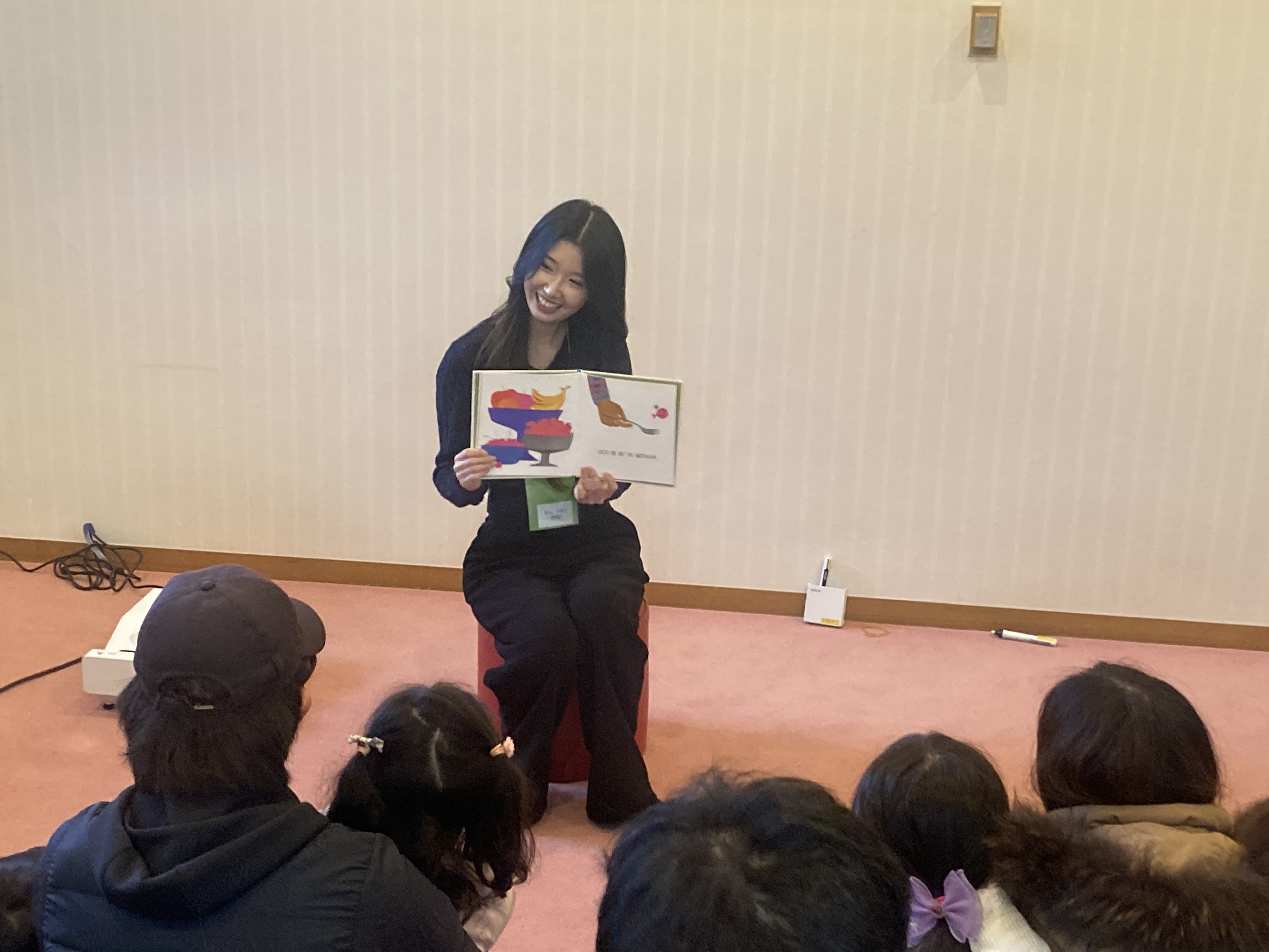 鶴舞中央図書館主催、名古屋市立大学国際交流センター協力によるイベントで、2014年から毎年開催されております。名古屋市立大学の留学生がそれぞれの母語等で絵本を日本の子どもたちに読み聞かせるというもので、今年は韓国語、英語、ドイツ語で行われました。来場者は4歳前後のお子さんやその保護者ら、約45名でした。絵本の朗読以外にも、留学生が出身国の文化や、それぞれの言語で動物の鳴き声を紹介しました。小さなお子さんから大人まで参加者みんなで交流することができました。